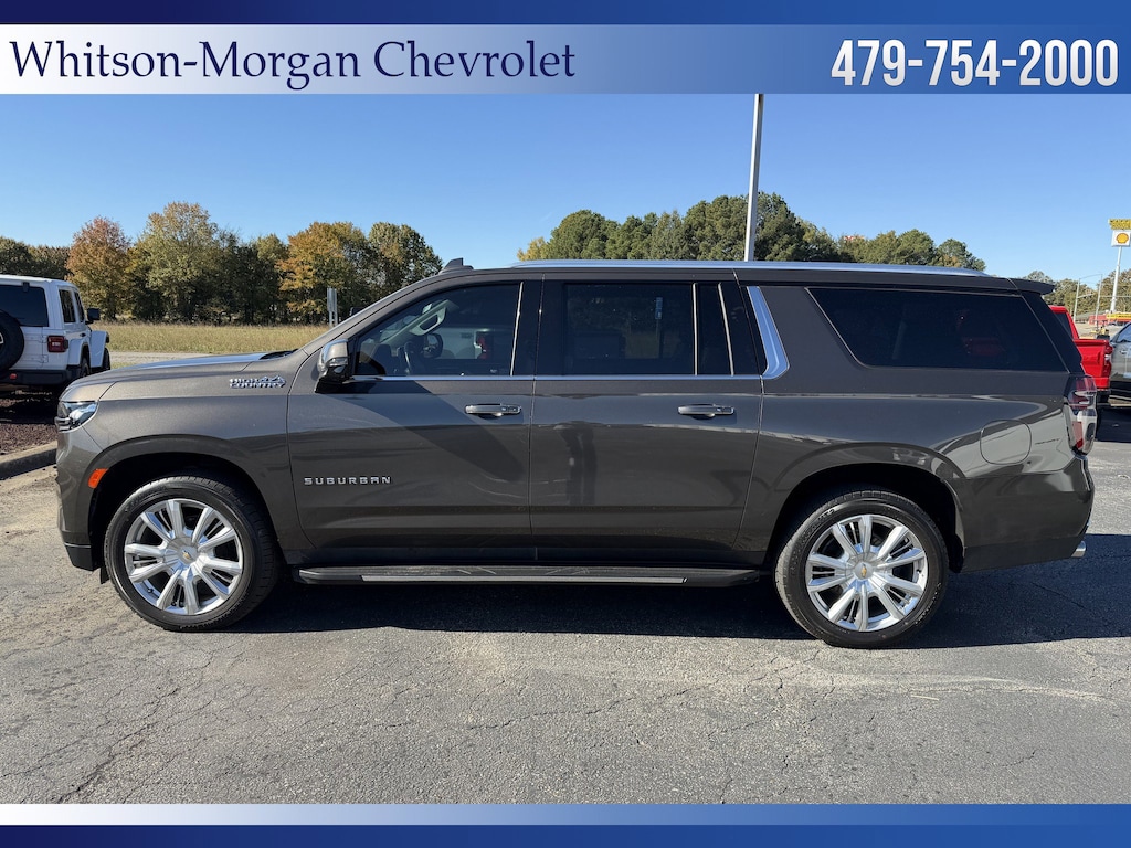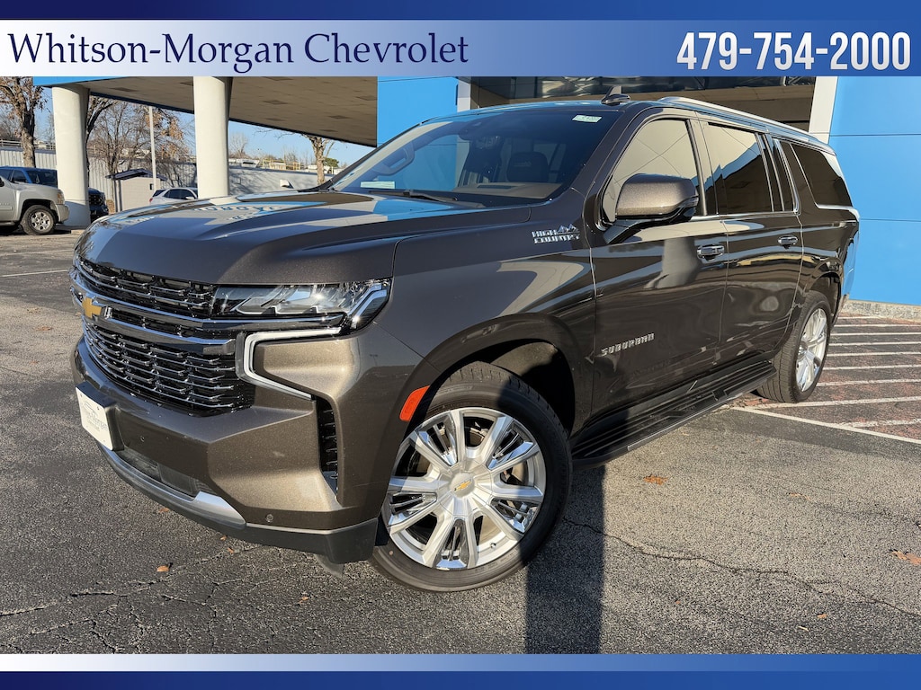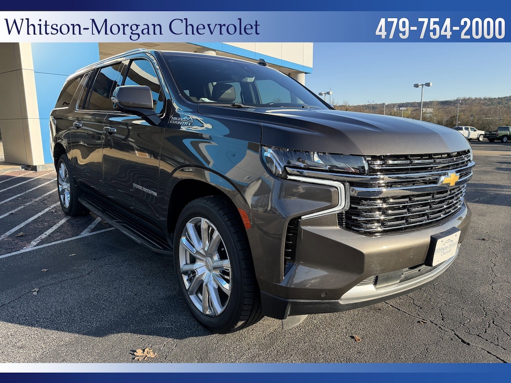 **2021 Chevy Suburban 4wd High Country ** Navigation ** 6.2L V8 ** Mocha Leather Interior ** Heated & Ventilated Front Seats, Heated 2nd Row Captain's Chairs, Heated Steering Wheel ** Dual Power Front Seats w/ Driver Memory ** Factory 22 Inch Chrome Wheels ** Bose Premium Factory Audio w/ 10.2 Inch Touchscreen, Apple Carplay, Android Auto, Satellite Radio, Bluetooth, 4G Wifi, Onstar ** Heads Up Display ** Magnetic Ride Control Suspension ** Power Folding 3rd Row Seat ** Forward Collision Alert w/ Auto Emergency Braking, Lane Keep Assistance, Lane Change Alert, Blind Spot Monitoring, Rear Cross Traffic Alert, Front and Rear Parking Assist Sensors, Front Pedestrian Braking, Rear Pedestrian Alert, Driver Alert, HD Surround Vision Camera ** LED Headlights & LED Taillights ** Remote Vehicle Start ** Remote Proximity Keyless Entry ** Handsfree Power Liftgate ** Power Folding, Heated Mirrors ** Trailer Towing Equipment ** Graywood Metallic Exterior w/ Black/Mocha Leather Interior (BEAUTIFUL COLOR COMBINATION & VERY HIGH OPTIONED)